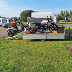 Janis mit dem Motorrad und wir mit dem Campergespann.
