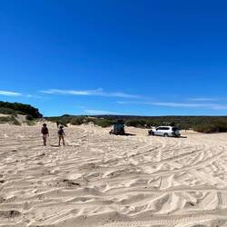 Das Wasser hatte wohl länger keine Verbindung mehr zum Ozean, denn es haben sich gleich zwei 4WD im Sand festgefahren. Man hört die Lift zischen, die aus den Reifen gelassen wurde. Bei dem einen ging die Befreiung schneller bei dem anderen sind wir nicht sicher, ob sie es wieder raus schafften.