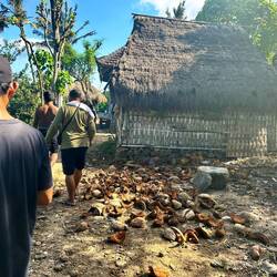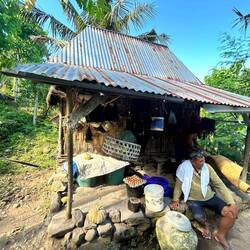 The second stop was the most touching. We drove further into the mountains to a small village. We stopped at a cluster of houses where many disabled people lived. In total, there were three blind people, a woman with mutilated legs, and two mentally disabled individuals. At this cluster, we delivered about half of the donations. Kartika makes these donations once or twice a month and knows these people quite well. The conditions in which these people live are tough enough, but having additional physical disabilities makes it even harder. The woman with the mutilated legs makes small baskets herself. It takes her about a week to make one basket, which she then sells for 34,000 IDR, which is less than 2 euros. Unfortunately, the demand for the baskets is decreasing, so they don't sell as well as before. The hardest moment for me was seeing how one of the mentally disabled lives, as seen in the first picture. He lives in this small shed and sits there all day looking out at the sea. The shed is set a little lower than the house next to it. He sleeps there, eats there, spends his time there, and even uses it as a toilet. The other mentally disabled individual also lives in a shed, which was a bit further away and which I could only see from about 10 meters distance.