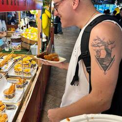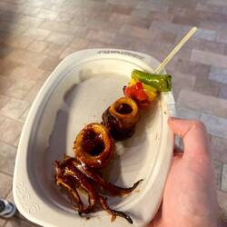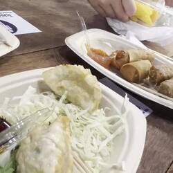 Angekommen in der ICON Mall, stöberten wir zunächst ein wenig herum, bevor ich mich den verschiedenen Spießen widmete. Zuerst probierte ich einen Garnelenspieß für 100 Baht (etwa 2,50 Euro), der wirklich lecker war. Danach gab es einen Oktopusspieß für 60 Baht (etwa 1,50 Euro), der ebenfalls gut schmeckte, allerdings etwas zäh und schwierig zu essen war. Anschließend gönnte ich mir noch Hühnchen Gyoza und vegetarische Frühlingsrollen mit Glasnudeln. Die Gyoza waren köstlich, die Frühlingsrollen jedoch kalt und daher nicht so gut, wie sie hätten sein können.