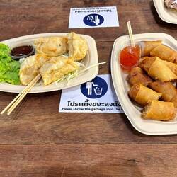 Upon arriving at the ICON Mall, we browsed around a bit before I turned my attention to the various skewers. First, I tried a shrimp skewer for 100 Baht (about 2.50 euros), which was really tasty. Then, I had an octopus skewer for 60 Baht (about 1.50 euros), which was also good but a bit tough and tricky to eat. Afterwards, I indulged in some chicken gyoza and vegetarian spring rolls with glass noodles. The gyoza were delicious, but the spring rolls were cold and therefore not as good as they could have been.