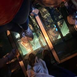 As a special feature at the end, there was a section with a glass floor on the way to the elevator down, allowing us to look hundreds of meters down.
