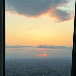 Das Design des Observationsdecks ist beeindruckend; es muss so konzipiert sein, dass es problemlos aushält, wenn 90% der Besucher zur Zeit des Sonnenuntergangs auf einer Seite stehen. Der Sonnenuntergang selbst war atemberaubend: Die Sonne verschwand kurz hinter Wolken am Horizont, bevor sie wieder auftauchte, und sank schließlich hinter einer Gebirgskette und verschwand – ein spektakulärer Anblick aus Tokio, der sich kaum mit einer Handykamera festhalten lässt.