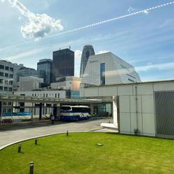When thinking of a bus station, many might initially imagine a grimy, open-air station, like the central bus station in Berlin or other bus stations. However, in Japan, it's different. We took the escalator to the fourth floor, where a beautiful waiting hall with ticket counters awaited us. The tickets were quickly purchased, and we sat down. Here too, the punctuality was impressive: Buses arrived every ten minutes, people boarded swiftly, and the buses departed on time. As soon as one bus left, the next arrived to load and unload passengers. Remember, this all happens on the fourth floor of a building! In the fourth picture, I try to capture the perspective of the fourth floor for you. After boarding, the bus drove down like in a parking garage, and the journey continued. Initially, we drove through urban Tokyo, but during the hour and a half drive, the scenery changed. The landscape became increasingly greener and eventually, we were driving only through mountainous forest landscapes until we finally saw Mount Fuji from the bus. I've attached an initial snapshot and a better picture just before arrival.