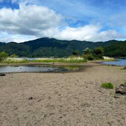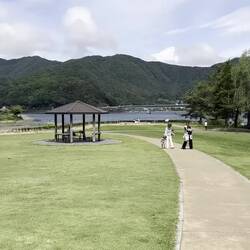 🇺🇸 Not far from our accommodation is Lake Kawaguchi. We are in the "Fuji Five" area, named after the five lakes surrounding Mt. Fuji. Lake Kawaguchi is the largest and most developed of the five lakes. Today, we wanted to use our limited free time to explore the lake a bit. We first walked along the eastern shore and passed by a cable car that goes to a viewpoint. However, since the sky was covered with thick clouds, we decided against taking the ride.