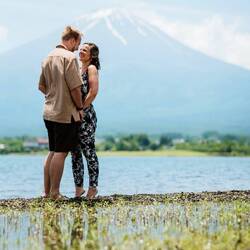 For the shoot itself, we were picked up by a driver from our accommodation at around 11 a.m. and driven to several locations. We visited the lakeshore, a public garden, and a beautiful shrine, capturing a variety of scenes. From almost every location, we could clearly see Mount Fuji!