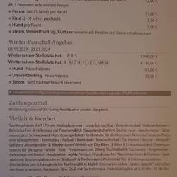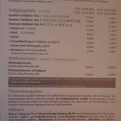 Im Februar 2023 kostete der Platz 39 € incl. Strom und Kurtaxe. Preisliste 2023 ist bei den Fotos.