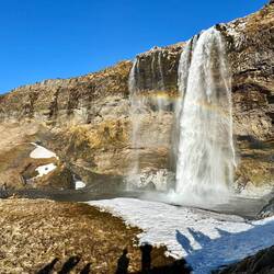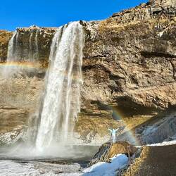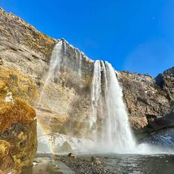 Danach ging es weiter zum „golden Circle“- Thingvellir- Nationalpark, Geysir- Geothermallandschaft und dem wunderschönen Wasserfall Gullfoss. Sehr beeindruckend das erste Mal einen Geysir ausbrechen zu sehen. Der Geruch ist tatsächlich gewöhnungsbedürftig und faule Eier trifft es doch ganz gut. Ganz besonders war aber der Ausflug zum Wasserfall Gullfoss, der mich mit einem wunderschönen Regenbogen in Empfang nahm. Ich war einfach nur gerührt, wie schön es dort war. Gigantische Berge, ein tosender Wasserfall und dann auch noch ein kompletter Regenbogen. (hab den Goldtopf am Ende übrigens nicht gefunden, dafür wurde mein Herz mit Gold gefüllt 😄) Ich konnte Anfang und Ende sehen. Bin aus dem Staunen nicht mehr rausgekommen. Auch da das erste Mal, dass ich solch ein schönes Naturspektakel beobachten durfte. Zwischenzeitlich waren es sogar 2 Regenbögen. Dort blieb ich eine Weile und schaute mich auch noch die anderen umliegenden Wasserfälle an. Einen konnte man aus einer Höhle heraus bestaunen. Nass wurde man da garantiert etwas 🥶. Auf dem Weg dorthin fielen mir Eingänge in den Bergen auf, die aussahen wie kleine Höhlen. Tatsächlich wurden sie früher von Farmern benutzt, um Vieh dort zu halten, oder andere Dinge zu lagern. Vielleicht versteckte sich auch der ein oder andere Troll darin. Hab geschaut und keinen gefunden. 😬