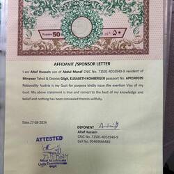 Eine Bestätigung von einem Sponsor, bei uns Altaf, der auf einem vom Notar beeidigten Papier (tolles Papier mit riesigem aufgedruckten Stempel) mit seiner Unterschrift und seiner ID-Karte für mich sozusagen gerade steht.