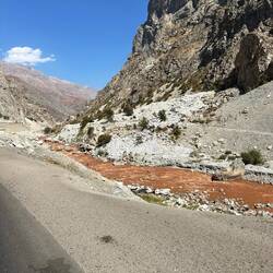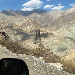 Ok! Wir machen uns also ungewaschen auf den Weg. Dann zweigt die Straße zum Iskanderkul See ab. 24 km, 1 Std. Fahrzeit. An diesem türkisblauen See hat sich der hiesige Präsident eine Villa hinbauen lassen, Einsam auf weiter Flur am See. Die Straße ist eine sehr schlechte Straße und es wundert mich, da doch der Präsident dort Sommerresidenz bezieht. Na, vielleicht fährt er ja mit dem Jeep. Am Ende des Tages weiß ich warum dem Präserl die Straße wurscht ist. Tja, 2 Helikopter-Landeplätze vor der Villa sprechen Bände.