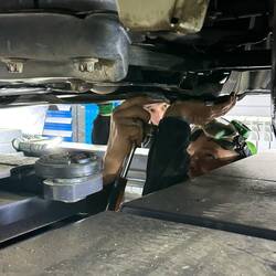 Alex konnte auch die Nietmuttern in der Werkstatt am aufgebockten Auto gut austauschen. In der Hitze des Gefechtes tauchte Alex noch seine Jacken beim Ausziehen unter dem Auto in die Ölwanne hinter ihm. Ich versuchte dann gleich noch in der Werkstatt die Flecken mit Waschmittel herauszuwaschen.