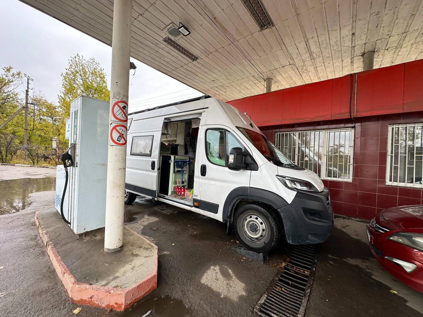 Danach musste er wieder kurz unters Auto. Bei einer aufgelassenen Tankstelle fanden wir einen halbwegs trockenen Platz. Hier endeckte Alex auch, daß nur mehr 2 Muttern die Bodenplatte hielten, die anderen drehten sich durch. So fuhren wir als erstes zum Werkzeugmarkt, hier erstand er noch eine Nietzange und 10er Niet-Muttern, denn unsere Schrauben an unserer Bodenplatte griffen nicht mehr. Das viele Gerüttel auf den schlechten Straßen hatten ihnen wohl zu sehr zugesetzt.