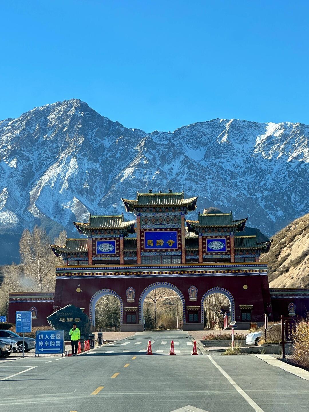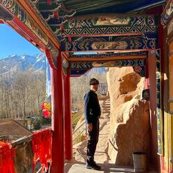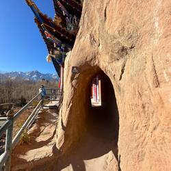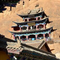Wir sind bewegen uns nun ganz nah schon an der schneebedeckten Bergkette und der Himmel ist stahlblau und wolkenlos. Die schöne Tempelfassade ist restauriert, und klebt wie ein farbiges Schwalbennest im lehmroten Felsen vor den Buddahöhlen.