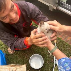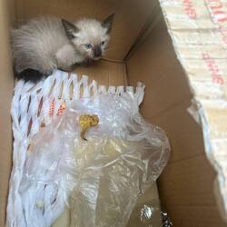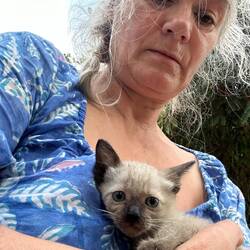 Alex ist schon unterwegs, bis ich endlich angezogen bin und mich mit den Krücken aus dem Van bugsiere. Ich humple zum abfallenden Flussufer, da entdecke ich einen Karton, er ist mit einem Gitter abgedeckt, und mit Steinen beschwert. Ich entferne das, und schaue hinein. Und da sitzt ein kleines Siamkätzchen mit stahlblauen Augen, ängstlich schaut sie mich an. Ich kann durch die Krücken den Karton nicht tragen, so schubse ich ihn vor mir her, bis wir Kohbi erreicht haben. Dort geh ich auf die Knie, und nehme das Kätzchen aus dem Karton. Vorher habe ich noch Kokosmilch angewärmt aus dem Eiskasten, aber sie will schleckt meinen Finger mit der Flüssigkeit nicht ab.