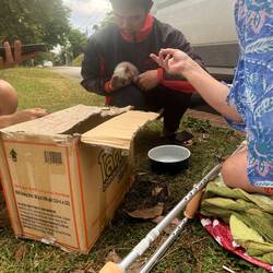 Er setzt sie vorsichtig hinein. Sie pfaucht ein wenig. Er wird für sie ein neues Lebensplätzchen suchen.