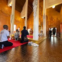 Sehr skuril, dieser neue buddihistische Tempel. Das eigenartigste ist der Mönch, welcher vor dem Buddha-Altar im Yogisitz betet. Ist er echt? Atmet er? Die Menschenströme schieben sich vorbei und ich kann kein Heben und Senken der Brust wahrnehmen, jedoch sein Muttermal am Rücken und die feinen Haare auf seinem Kopf.