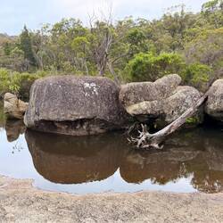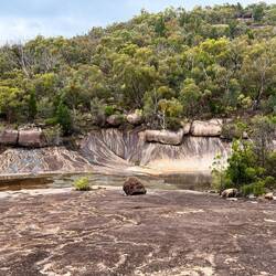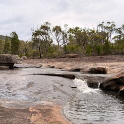 Der Weg in den Giraween Nationalpark war eine Schotterstraße. Sehr hügelig. Wir blieben an einem Aussichtspunkt stehen, um uns einen schönen Wasserpool anzusehen, wo anscheinend Schnabeltiere zu sehen gewesen wären.