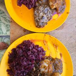Zum Mittagessen waren wir dann wieder zurück bei Kohbi. Wir verfeinerten das Rotkraut noch mit Rotwein, und die Linsen-Pilz Leibchen wanderten in das Backrohr. Die erste Charge Kartoffelnködel wanderte ins siedende Wasser, bei der zweiten Fuhre machte ich den Teig mit Maisstärke noch etwas fester.