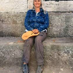 Wieder einmal wurde der Himmel schwarz beim Retourweg und es begann zu regnen. Auf einmal redete uns eine Frau an, sie saß wie eine Aborigine-Frau unter einem überhängenden Felsen und wartete auf das Ende des Regens. Wir plauderten fast eine ganze Stunde mit ihr, wir im Nieselregen auf der Felsplatte stehend und sie unter ihrem Felsendach. Es war lustig und erheiternd und so verabredeten wir, dass wenn sie unten bei unserem Van vorbeikommen würde, sie einfach mal einen Sprung bei uns reinschaute.