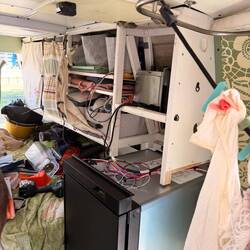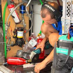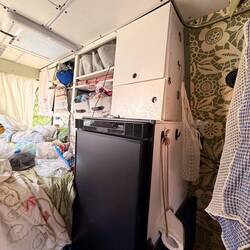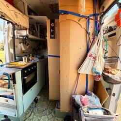Zuerst testen wir unsere kleine Cuisinart Maschine. Füllte alles ein und ich verankerte die Maschine in einer Kiste am Boden und sicherte sie mit einem Spanngummi in unseren Bodenösen und Alex steckte sie mit einem Adapterstecker an unsere Konverter-Steckdose.