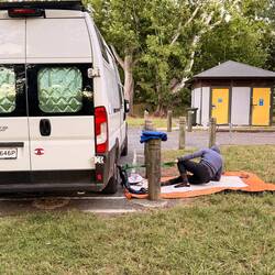 Danach gönnten wir uns auf dem leeren Parkplatz zwischen Kohbis Hecktüren eine herrliche Dusche und beschlossen, die Nacht hier stehen zu bleiben, da es keine Verbotsschilder gab, die das Campen hier verbieten würde.