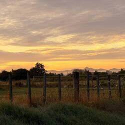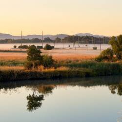 Der orange gefärbte Himmel kündigte die Sonne an. Rosa angestrahlte Wolken standen über uns und zwischen den Hügeln und Feldern, breitete sich der weiche weisse Morgennebel über die tieferen Täler aus.