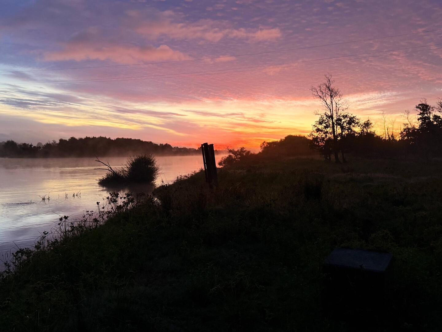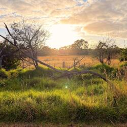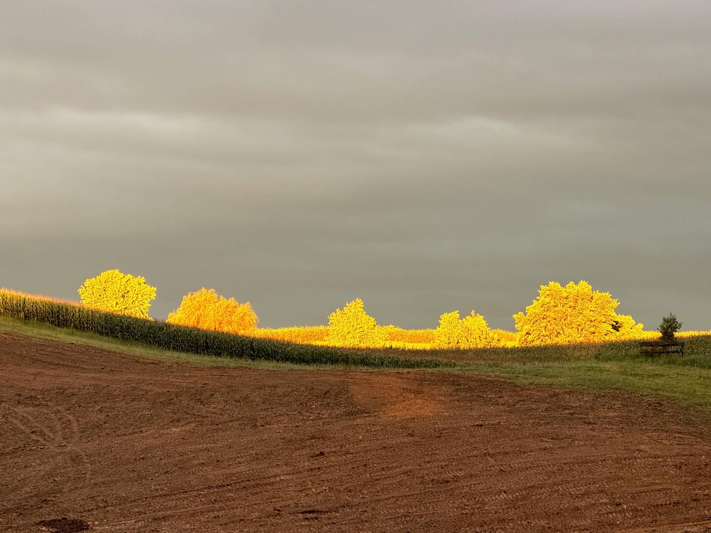Wunderschön beleuchteten die Sonnenstrahlen eine Buschreihe hinter Stevens Feldern und hob sie dadurch vom dunklen Wolken verhangenen Himmel ab.