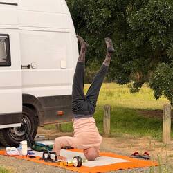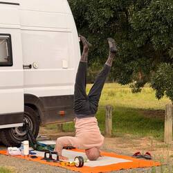 Nach dem Aufstehen gabs noch eine Runde Yoga im Gras neben unserem Van, während rund um uns in aller Ruhe die Kängurus ihr Grasfrühstück knabberten.