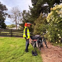 5 Minuten später, als wir auf der Straße so dahin strampelten, hörte ich das Geräusch eines Motorrades. Aus einer Schotterstraße kam ein groß gewachsener Farmer auf seiner Geländemaschine. Er blieb stehen, und ich fragte ihn, ob er einen Zeltplatz für uns wüsste.