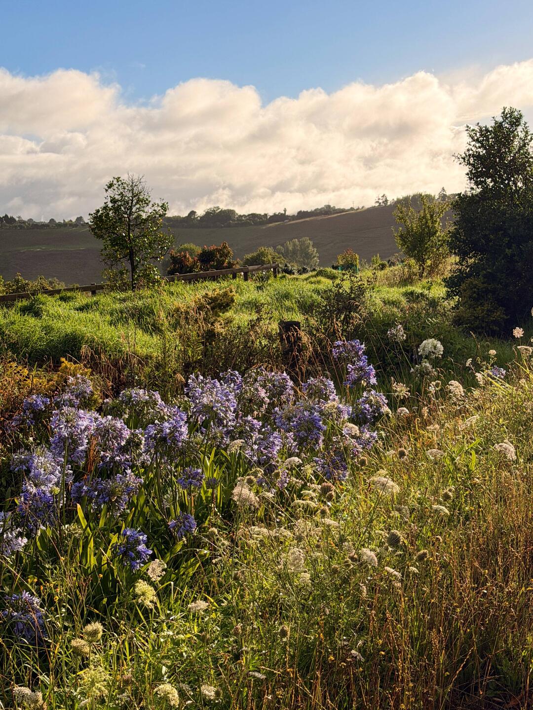 Die Straßenränder waren üppig bewachsen mit blau und weiß blühendem Zierlauch. Auf den hohen Graswiesen blühten gelbe Blumen und weiße wilde Möhren. Es roch nach nasser Erde und leichtem frischen Blumenduft.