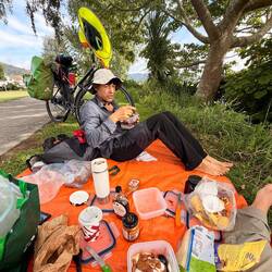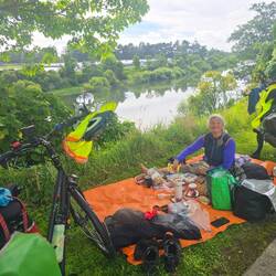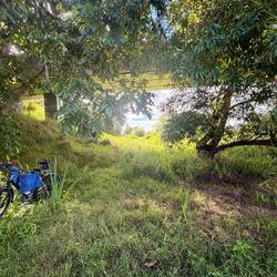 So schlug ich den nächsten schattigen Platz direkt neben dem Radweg mit mannshohem Gras vor. Unsere Diva willigte ein. Kurz darauf ließen wir uns unser Mittagessen im weichen Gras Bett gut schmecken.