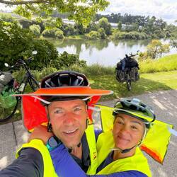 Wir machten noch ein Erinnerungsfoto und dann ging es bergab in den Supermarkt von Mangakino. Dort deckten wir uns für die nächsten 2 Nächte ein und waren froh, das uns Sue in ihrer netten Unterkunft freundlich empfing. Wir hüpften gleich unter die warme Dusche, denn durch das lange Quatschen mit den beiden Bikebackern war uns ziemlich kalt geworden. Sue wusch und trocknete unsere Kleidung ohne dafür Entgelt zu nehmen, und wir waren froh den Nachmittag und Abend im Warmen und Trockenen zu verbringen.