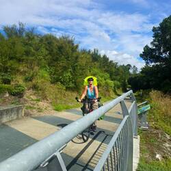 Dann ging es den Rivertrail weiter, viel bergauf und bergab,insgesamt 500 hm und 48 km, es war sehr anstrengend, waren doch die Steigungen nach meinem Gefühl ca. 30% und meinen Oberschenkeln ging dann doch irgendwann die Kraft aus. Ich musste einfach ab und an absteigen, meine fast 150 Pulsschläge runterbringen und das Rad schieben.