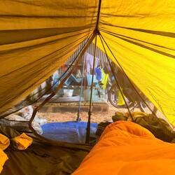 Wir zogen unsere komplett durchnässte Kleidung aus und hingen sie auf den Eisenverstrebungen zum Trocknen auf. Auch unsere Schuhe waren komplett nass. Endlich hatten wir trockene Kleidung an, das Zelt war aufgestellt. Ich musste 3 mal niesen, und Alex riet mir meine Haare trocken zu rubbeln mit dem Handtuch. Das tat ich und danach versuchte ich mich im Schlafsack wieder aufzuwärmen.