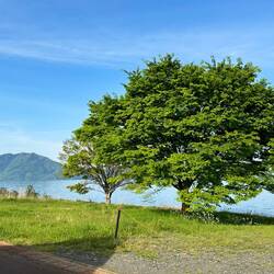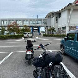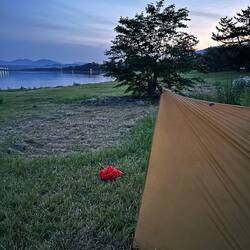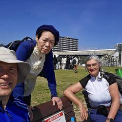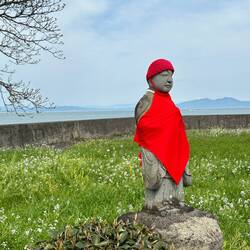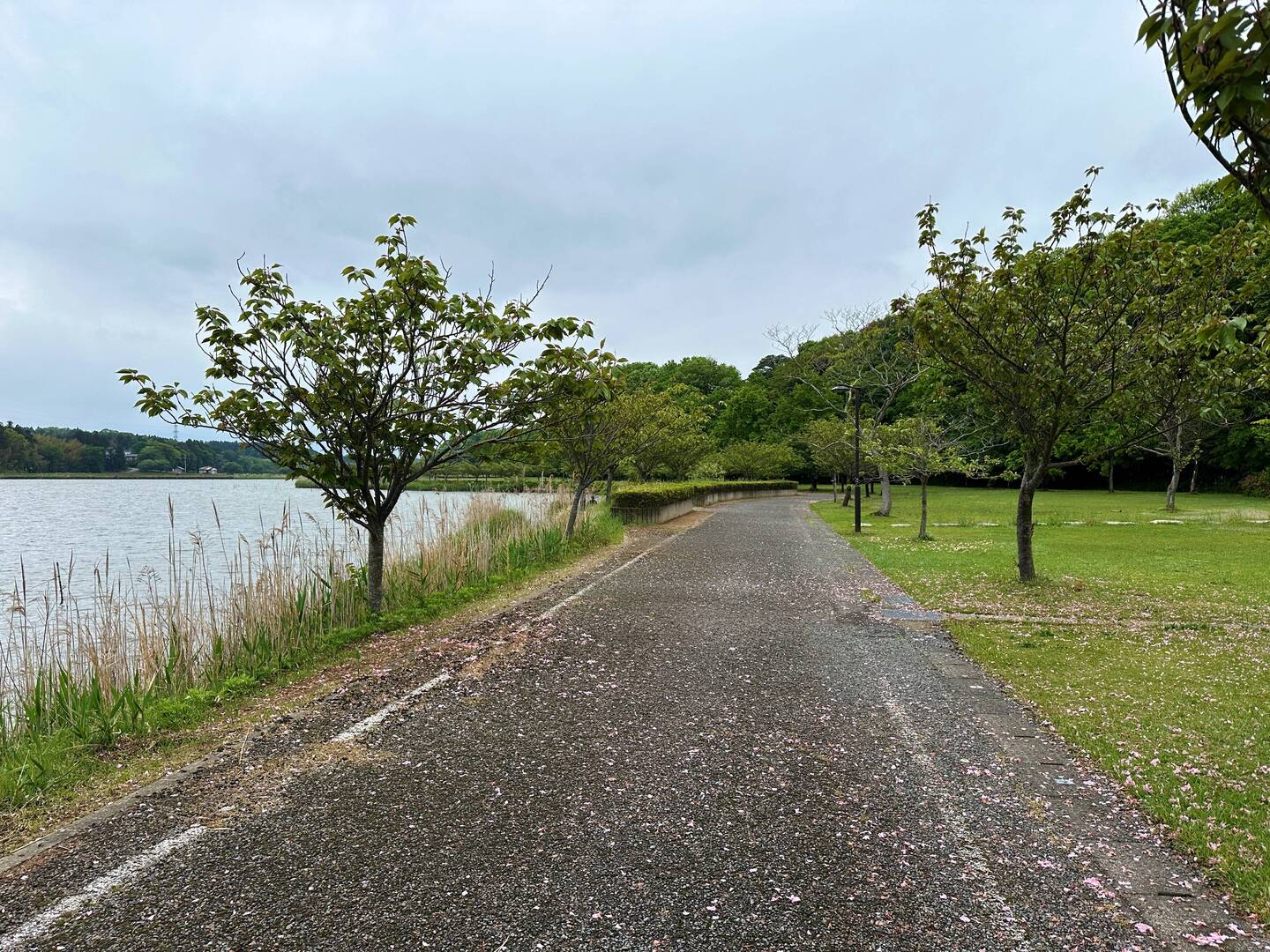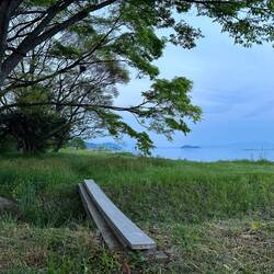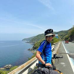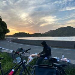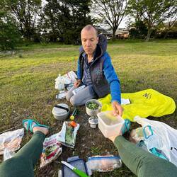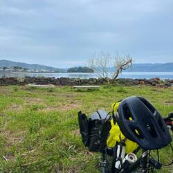 Die Berge in der Ferne wurden niedriger und die Nebelwolken blieben an einer bestimmten Höhenlinie hängen. Nun hatten wir auch noch Gegenwind bei der Fahrt durch das landwirtschaftliche Gebiet, aber wir wollten heute unbedingt noch ganz nahe an die Westküste Japans gelangen. Um 16:30 letzte Anfahrt zum Supermarkt in Awara, kurz vor dem Meer. Abendessen einkaufen. Gut ausgestattet mit Proviant, gings noch bisl berauf, bergab und wir hatten unseren Schlafplatz erreicht. Den hatte ich auf Google Maps Satelit rausgesucht. Einen Park am Binnenmeer, der wie ein See im Wald lag, Kirschbäume säumten einen Asphalt weg und die herabgefallenen rosa Blüten rahmten den Wegesrand farbig ein. Ein blühender Azaleenbusch bot uns den nötigen Sichtschutz, eine Granitbank war ideal zum Kochen und Dinieren, und das Sanitärgebäude, das 30 Schritte vom aufgestellten Zelt entfernt lag, war eine tolle Infrastruktur, die wir gerne nutzten.