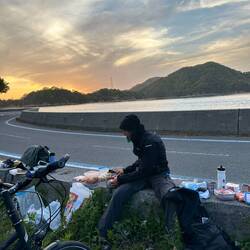 Und da, endlich hatten wir wieder das Meer erreicht. Während dem Zeltaufstellen und Abendessen herrichten, bot sich uns ein wunderschöner Sonnenuntergang und wir sahen zum ersten Mal seit wir in Japan waren, die Sonne im Meer versinken.