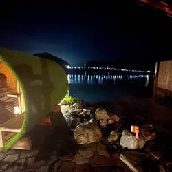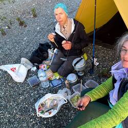 Platz direkt am Meer gefunden. Das Abendessen gekocht - und dann der nächste Schreck: die Unterlagsmatte von Alex hatte ein Loch - also alles Pickzeug geholt, das Loch war schnell gefunden, und nun müssen wir nur noch warten bis es trocken ist, dann können wir es wieder aufpumpen.