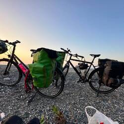einen heißen Kaffee gegönnt. Als Alex wieder da ist, beginnen wir die Reiseräder gut zu verpacken, sowie unseren Rucksack und die Radpacktaschen.