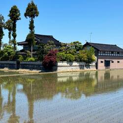 Dann gings weiter im Nieselregen durch die Ebene von Fukui, hier reiht sich eine kleine Stadt an die andere, dazwischen unterbrochen von Tausenden gefluteten Reisfeldern, in denen sich die Regenwolken spiegeln, oder wenn ein Windstoß kommt, sich die Oberflächen zu kräuseln beginnt. Dazwischen waten weiße Reiher und Kraniche durch die Felder auf der Jagd nach Fröschen und anderem Getier.
