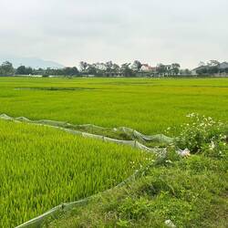 Wir radeln durch wunderschöne eckig angelegte Reisfelder, die in den unterschiedlichsten Grüntönen um die Wette strahlen, darüber der grau verhangene Himmel. Unterschiedlicher könnte der Kontrast nicht sein.