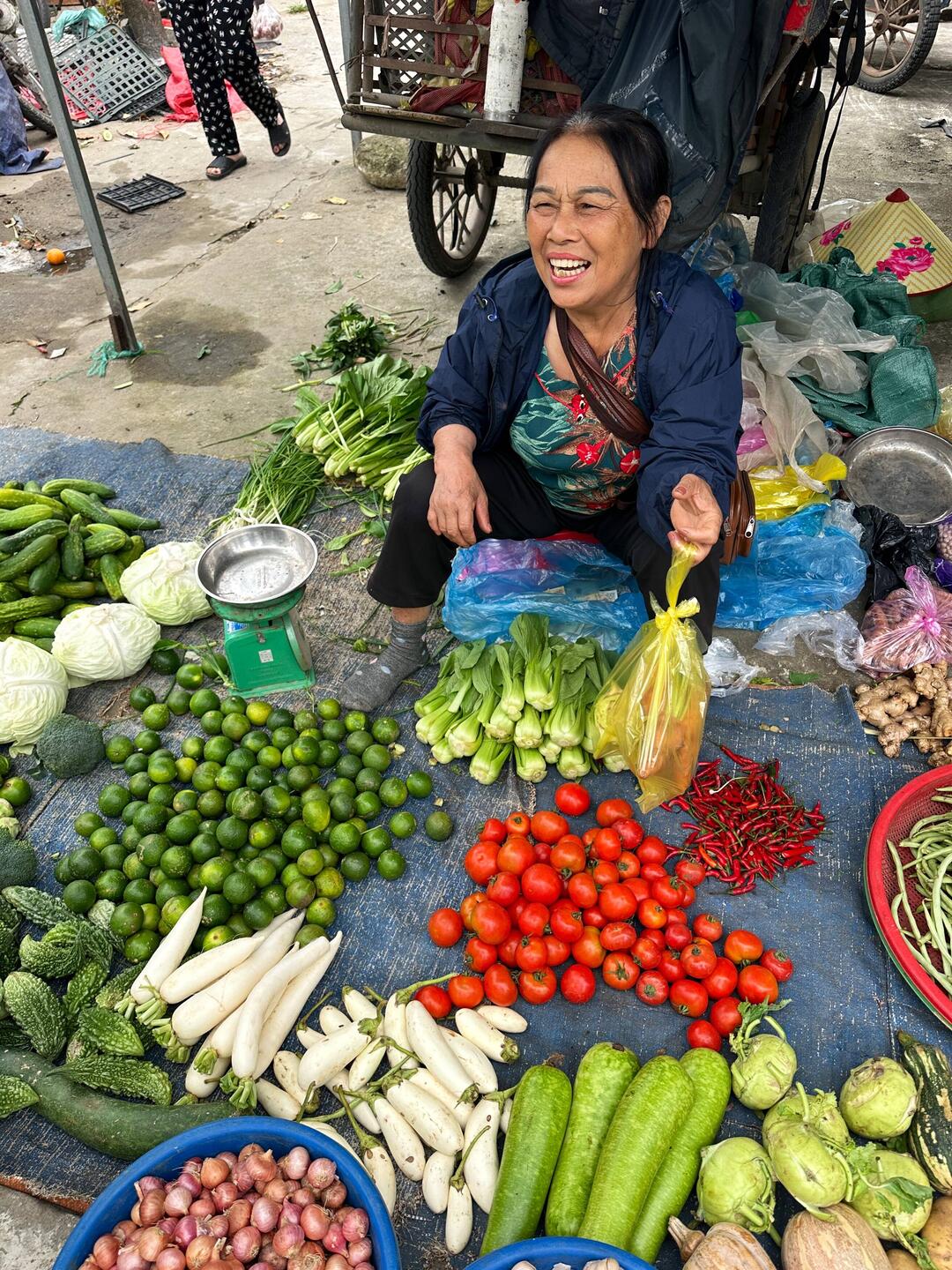 Da wir keine Vorräte mehr haben, kaufen wir auf einem Dorfmarkt wieder herrliches Obst und Gemüse ein.