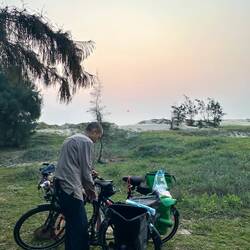 dass sie Australierin ist und er Italiener. Sie fahren so 70 km am Tag und übernachten ausschließlich in Hotels, da sie so billig wären. Sie würden am Strand auf uns warten. ?????? Auf welchem Strand?