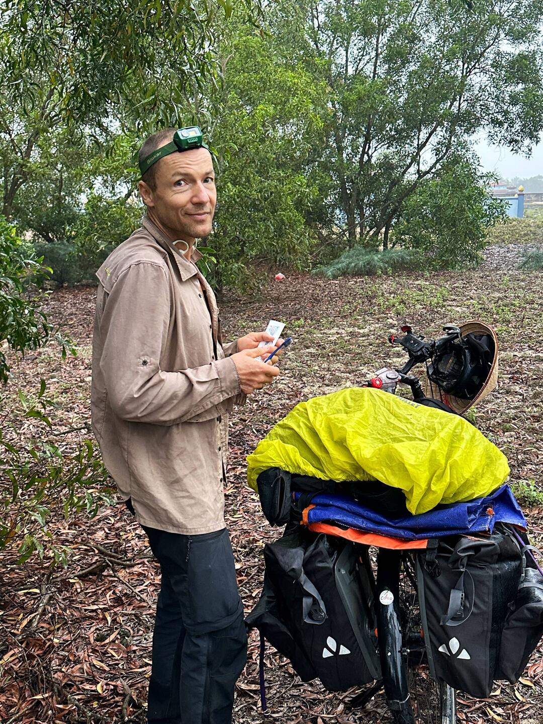 Zu guter Letzt, ist es dunkel, als ich Alex endlich erreiche. Er hat auf einem schmalen Bergaufpfad neben der Straße dann doch eine ebene Stelle gefunden.