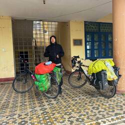 Endlich! Jetzt hält er. Aber in der nächsten Stadt müssen neue Schläuche in genau meiner passenden Dimension her.