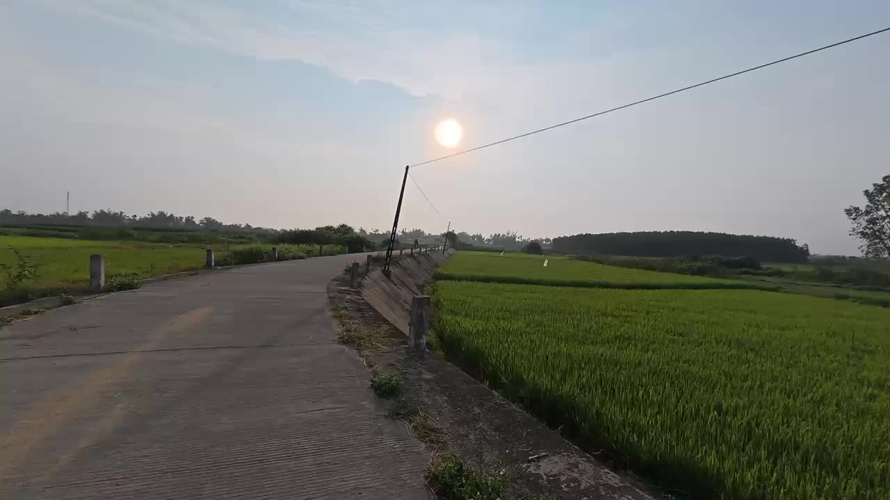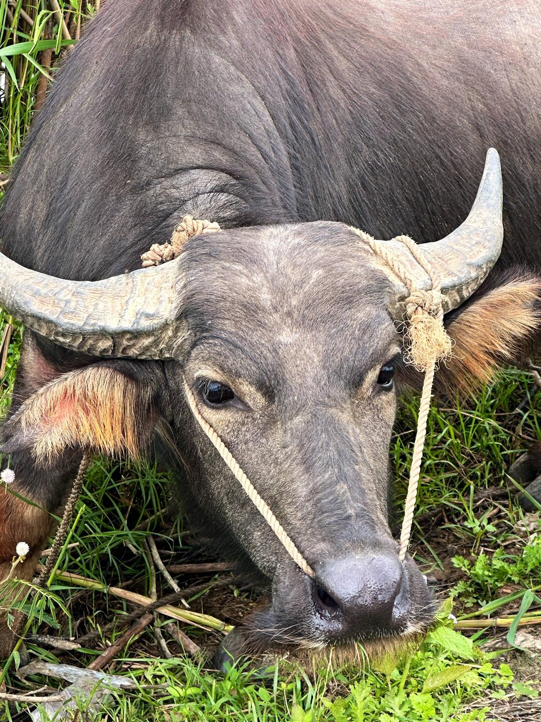 Endlich, zwischen 2 Betriebsgebäuden nehmen wir einen schmalen Trampelpfad nach hinten zu den Reisfeldern. Ein kleiner Busch gibt ein wenig Schatten, und die Diva ist nach dem Frühstück wieder zufrieden,satt und umgänglich.