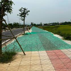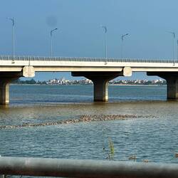 Dann geht es gleich mal durch einen Tunnel. Alex hat in weiser Vorraussicht die Straße gewählt. Ich, mit meiner großen Angst vor den Lkws den erhöht gebauten Gehsteig für Fußgänger. Eine Tortur wie sich herausstellt. Denn alle 100 m liegt ein 10 cm dicker großer Betonblock auf der Strecke, ich muss jedesmal absteigen und mein Rad rauf und wieder runter heben. In der Mitte dann der Supergau! Ein 50 cm breites Loch! Irgendwie schaffe ich es, mein Radl drüberzuheben, mit ungeheurer Kraftanstrengung. Dann ist der Gehsteig unterbrochen, ein paar Stufen gehen hinunter auf die Fahrbahn. Dann geht der Steg mit Stufen hinauf nach 10 m wieder weiter. No way! Ich nehme die Fahrbahn.