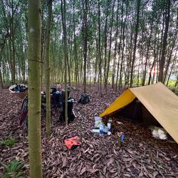 Dann ging schon das Schlafplatz suchen los. Heute war es nicht einfach. Wunderschöne Kautschukwäldchen, die Stämme in Reih und Glied, waren sehr einsichtig.