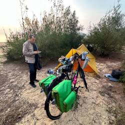 Eine steile Abfahrt führt zu einem ebenen Plätzchen neben einem Fluss. Für mich nicht sauber genug, für Alex super. Während er die Räder und das Gepäck den Abhang nach unten bringt, kaufe ich noch 3 Liter Wasser. Zum Kochen und Waschen.