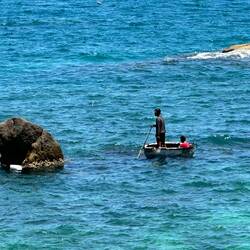 Dieser liegt etwas höher über dem Meer, wir sehen auf eine kleine Bucht mit Sand und vielen runden Felsen mit klarem Wasser.