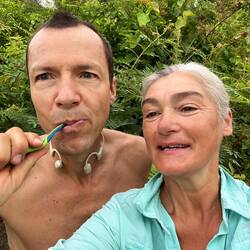 Danach waschen wir uns das Salzwasser mit einem in Trinkwasser eingetauchten Waschlappen notdürftig vom Körper.